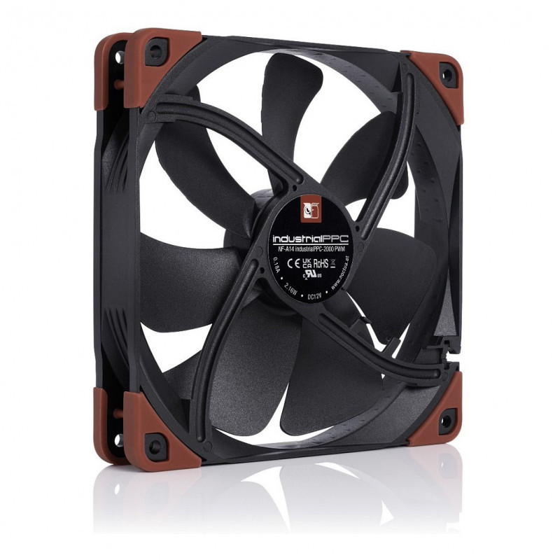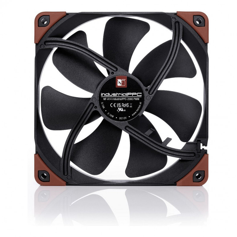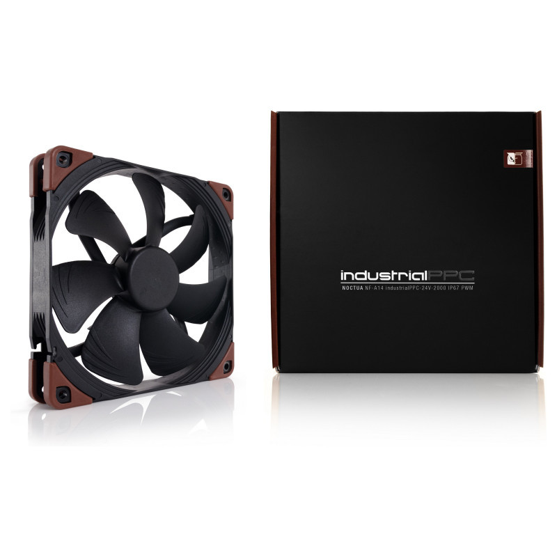 "Noctua NF-A14 INDUSTRIALPPC-2000 PWM. Type: Fan, Fan diameter: 14 cm, Rotational speed (min): 500 RPM, Rotational speed (max): 2000 RPM, Airflow: 182.5 m³/h, Maximum air pressure: 4.18 mmH2O, Bearing type: Self-Stabilising Oil-pressure Bearing (SSO). Voltage: 12 V. Width: 140 mm, Depth: 25 mm, Height: 140 mm. Product colour: Black, Brown"\n"Conceived for industrial heavy duty applications that require enhanced cooling performance and advanced ingress protection, the NF-A14 industrialPPC (Protected Performance Cooling) is a ruggedised high-speed version of the award-winning retail model. Thanks to the outstanding aerodynamic efficiency of the NF-A14 design and the use of a novel three-phase motor, the industrialPPC version provides superior airflow and pressure capacity while keeping noise levels and power consumption moderate as against comparable high-speed fans. While its fibre-glass reinforced polyamide construction and certified water and dust protection make the NF-A14 industrialPPC suitable for operation in challenging environments, the renowned SSO2 bearing technology guarantees an MTTF of over 150.000hrs. Topped off with Noctua’s trusted reliability and 6 years manufacturer’s warranty, the NF-A14 industrialPPC is an ideal choice for highly demanding applications that require superior flow rates and ultimate dependability.