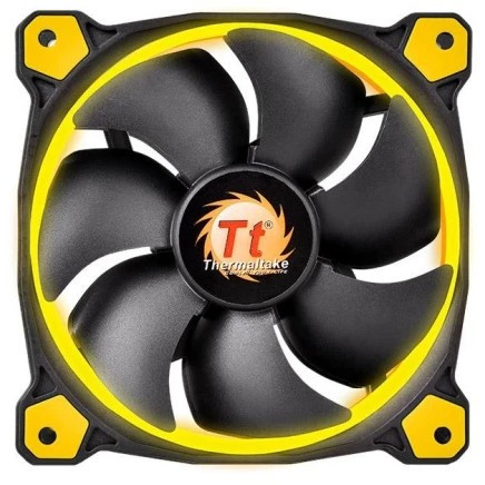 "Thermaltake Riing 14. Type: Fan, Fan diameter: 14 cm, Rotational speed (max): 1400 RPM, Maximum air pressure: 1.58 mmH2O. Voltage: 12 V. Width: 140 mm, Depth: 140 mm, Height: 25 mm. Product colour: Black, Yellow"\n"Riing 14 High Static Pressure LED Radiator Fan