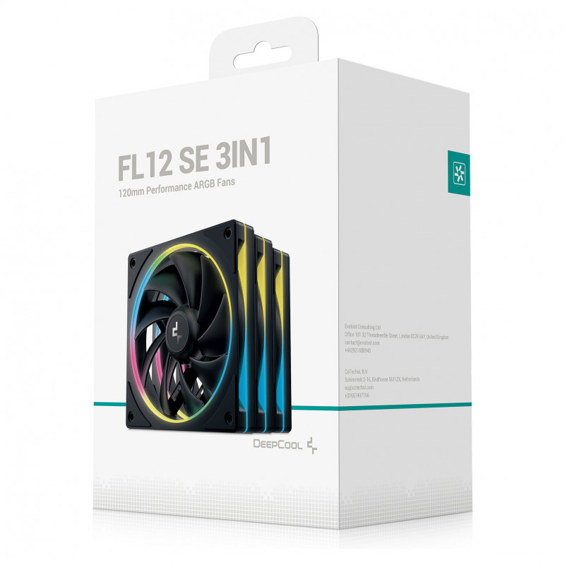 "DeepCool FL12 SE 3IN1. Type: Fan, Fan diameter: 12 cm, Rotational speed (min): 400 RPM, Rotational speed (max): 1900 RPM, Maximum air pressure: 2.04 mmH2O, Bearing type: Hydraulic. Product colour: Black"\n"The DeepCool FL12 SE delivers stunning lighting effects with 20 individually addressable RGB LEDs, combining vibrant colors with exceptional cooling performance. Three FL12 SE fans are included in this package.