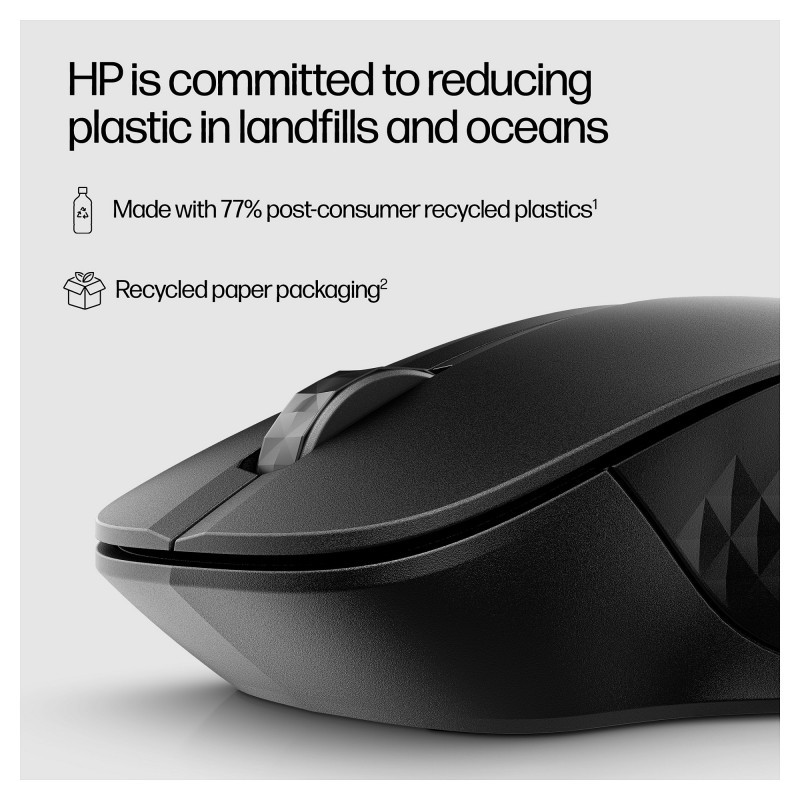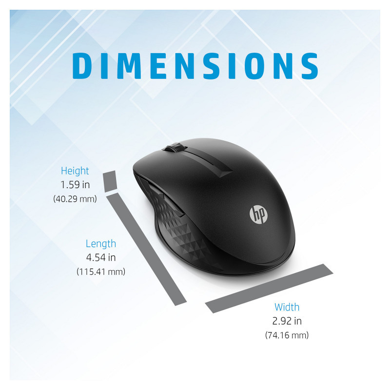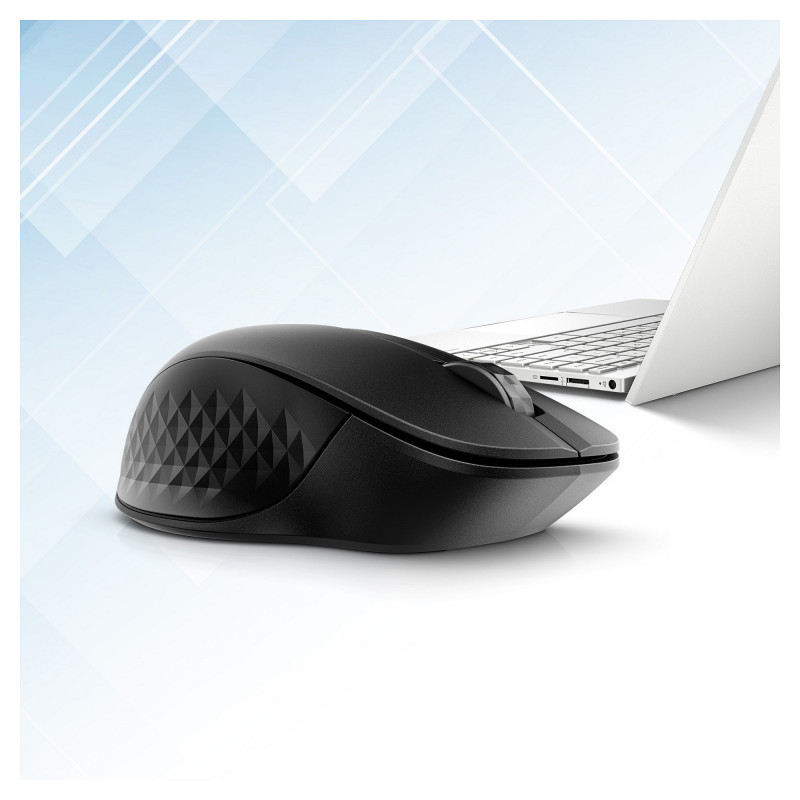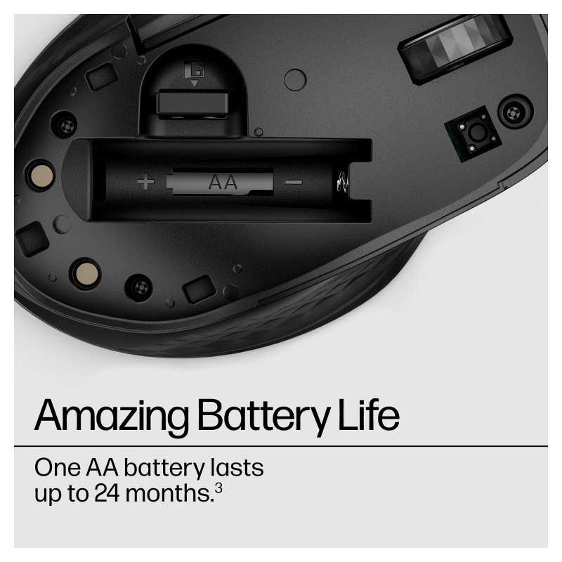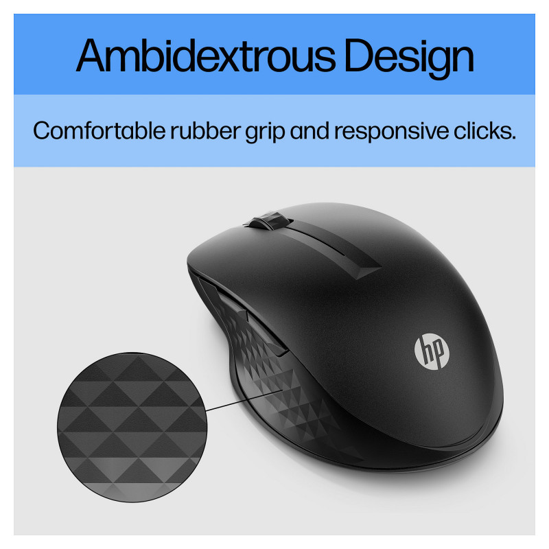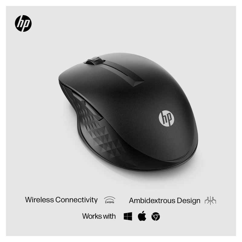 "HP 430 Multi-Device Wireless Mouse. Form factor: Ambidextrous. Movement detection technology: Optical, Device interface: RF Wireless + Bluetooth, Movement resolution: 1200 DPI, Buttons type: Pressed buttons, Buttons quantity: 5, Scroll type: Wheel. Power source: Batteries. Product colour: Black"\n"Everything Just Clicks