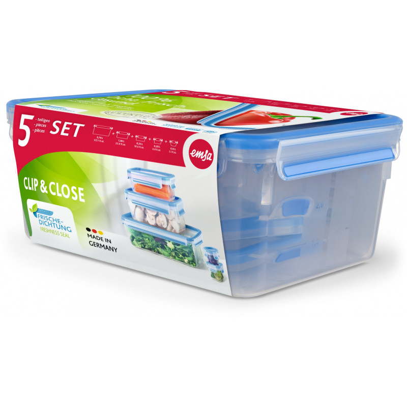 "EMSA CLIP & CLOSE 508568. Type: Set, Form factor: Rectangular, Capacity: 3.7 L. Weight: 900 g, Package width: 195 mm, Package depth: 263 mm. Quantity per pack: 5 pc(s). Pallet gross width: 80 cm, Pallet gross length: 120 cm, Pallet gross height: 114 cm"\n"Fresh food really does stay fresh for a long time in the CLIP & CLOSE food storage containers! Thanks to the unique freshness seal in the lid, not ony are these containers up to 100% leakproof, but they are also 100% hygienic as they don't allow germs to accumulate in the gaps. Because the CLIP & CLOSE containers are BPA-free, they’re completely safe for baby food. Perfect for the fridge, freezer, microwave and for healthy food on the go."