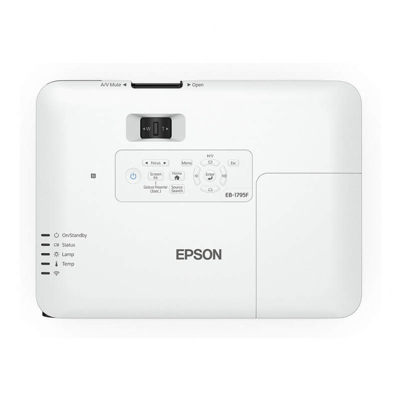 "Epson EB-1795F. Projector brightness: 3200 ANSI lumens, Projection technology: 3LCD, Projector native resolution: 1080p (1920x1080). Light source type: Lamp, Service life of light source: 4000 h, Service life of light source (economic mode): 7000 h. Focus: Manual, Focal length range: 13.52 - 16.22 mm, Aperture range (F-F): 1.58 - 1.7. Supported graphics resolutions: 1920 x 1080 (HD 1080), Supported video modes: 1080p, Video processing: 10 bit. Wi-Fi standards: 802.11b, 802.11g, Wi-Fi 4 (802.11n)"\n"Ultra-mobile business projector