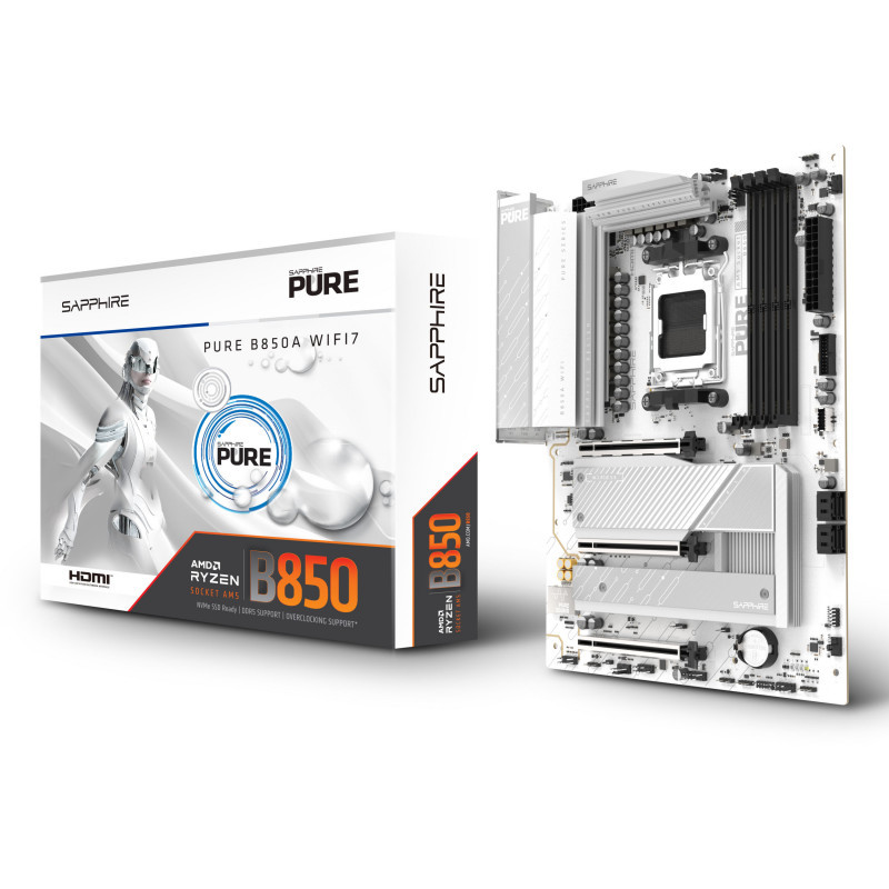 "Sapphire PURE B850A WIFI 7. Processor manufacturer: AMD, Processor socket: Socket AM5, Compatible processor series: AMD Ryzen 7000 Series, AMD Ryzen 8000 Series, AMD Ryzen 9000 Series. Supported memory types: DDR5-SDRAM, Maximum internal memory: 256 GB, Memory slots type: DIMM. Supported storage drive interfaces: PCI Express 4.0, PCI Express 5.0, SATA III, Supported storage drive types: HDD & SSD. USB connector type: USB Type-A, USB Type-C. Ethernet interface type: 2.5 Gigabit Ethernet, LAN controller: Dragon RTL8125BG, Top Wi-Fi standard: Wi-Fi 7 (802.11be)"\n