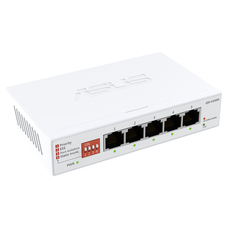"ASUS QG-U1050. Switch type: Unmanaged. Basic switching RJ-45 Ethernet ports type: 2.5G Ethernet (100/1000/2500), Basic switching RJ-45 Ethernet ports quantity: 5. MAC address table: 16000 entries. Networking standards: IEEE 802.3ab, IEEE 802.3az, IEEE 802.3bz, IEEE 802.3u, IEEE 802.3x. DC input voltage: 12 V"\n"Upgrade to the 2.5G Ultra-Fast Network