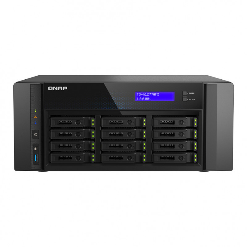 "QNAP TS-H1277AFX-R7-32G. Type: NAS. Chassis type: Tower. Device class: Small & Medium Business. Processor family: AMD Ryzen™ 7, Processor frequency: 3.8 GHz. Internal memory: 32 GB, Internal memory type: DDR5. Total installed storage capacity: 0 TB. Operating system installed: QuTS hero"\n"TS-h1277AFX