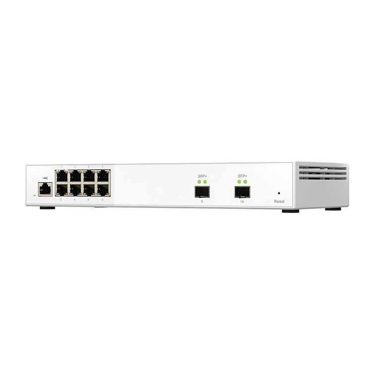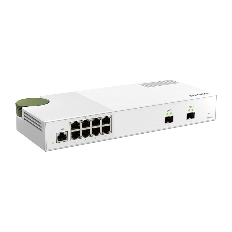 "QNAP QSW-M2108-2S. Switch type: Managed, Switch layer: L2. Basic switching RJ-45 Ethernet ports type: 2.5G Ethernet (100/1000/2500), Basic switching RJ-45 Ethernet ports quantity: 8, Console port: RJ-45. Full duplex. MAC address table: 16000 entries, Switching capacity: 80 Gbit/s. Networking standards: IEEE 802.1Q, IEEE 802.1ab, IEEE 802.1p, IEEE 802.1w, IEEE 802.3, IEEE 802.3ab, IEEE 802.3ad, IEEE.... DC input voltage: 12 V"\n"The QSW-M2108-2S is a Layer 2 Web Managed Switch with two 10GbE SFP+ ports and eight 2.5 Gigabit ports. Supporting Layer 2 switching and network management via a user-friendly web user interface, the QSW-M2108-2S offers flexible deployment in hybrid high-speed network environments and provides an entry-level network management solution that is usable even by non-IT professionals. With high performance, user-friendly management, and desktop form factor, the QSW-M2108-2S enables cost-effective upgrading to 2.5GbE or 10GbE networking while optimizing bandwidth and ensuring secure network maintenance.