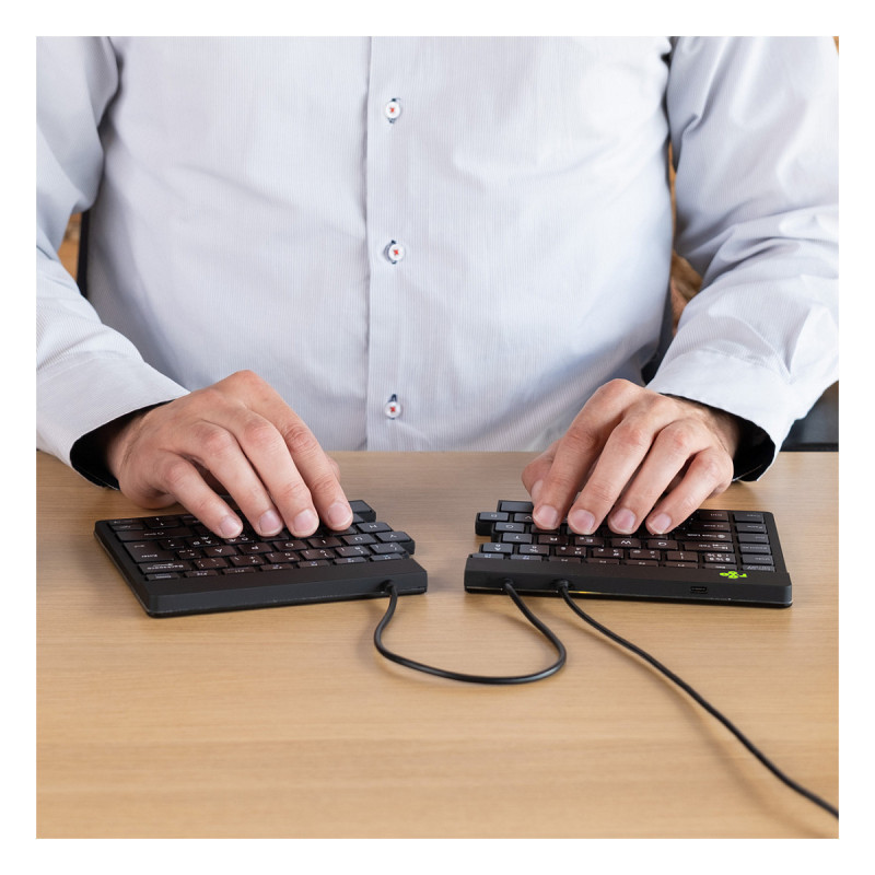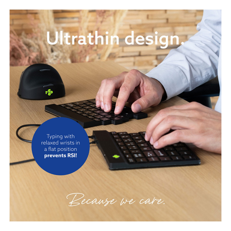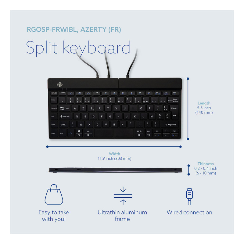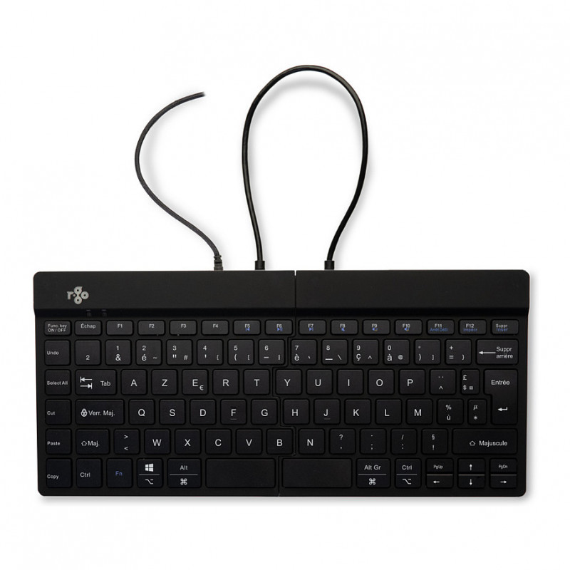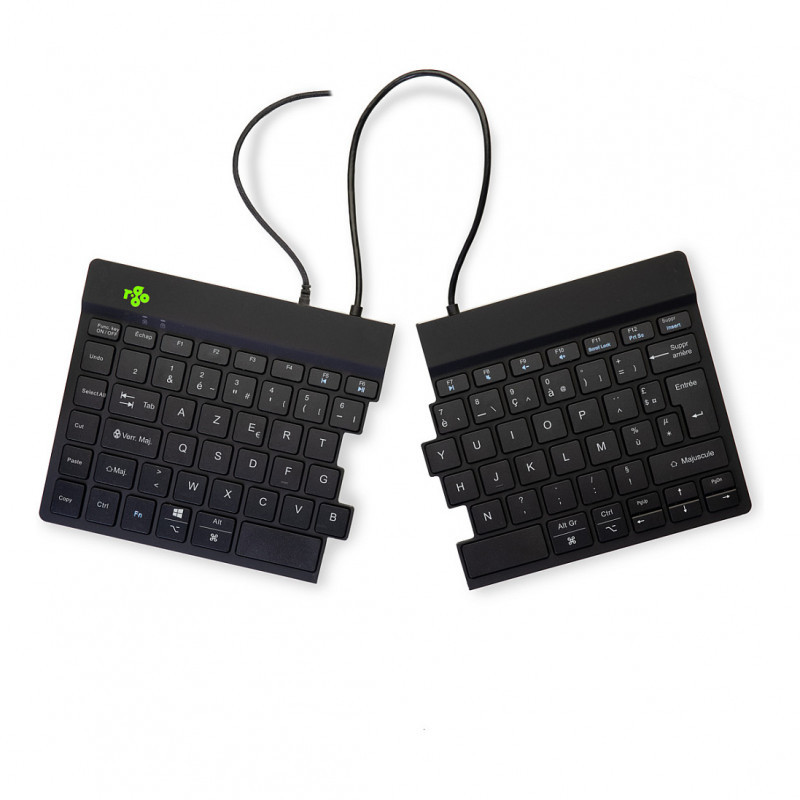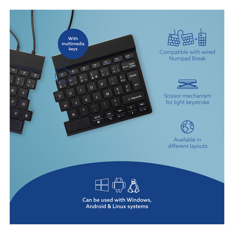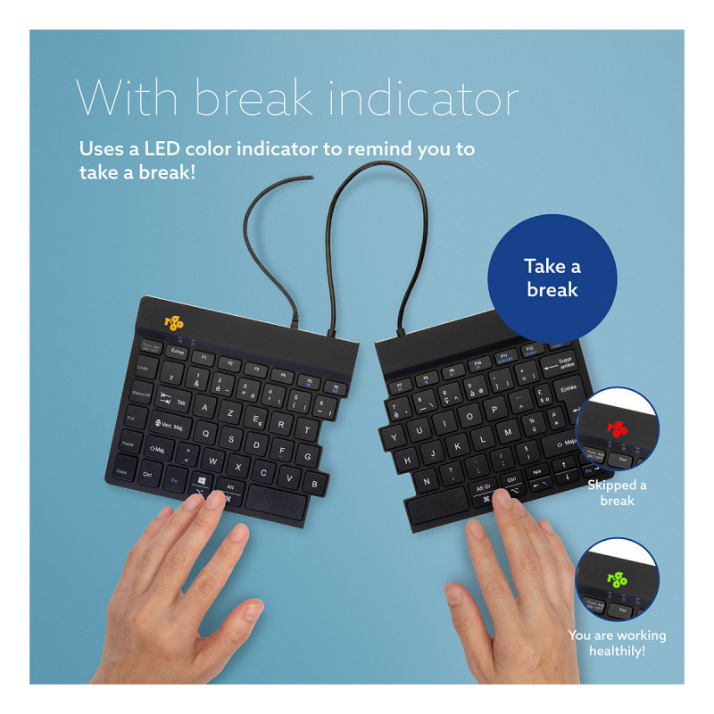 "R-Go Tools Ergonomic keyboard R-Go Split Break v2 with break software, ergonomic split keyboard, AZERTY (FR), Wired, black. Keyboard form factor: Mini, Connectivity technology: Wired, Device interface: USB, Keyboard key switch: Scissor key switch, Keyboard layout: AZERTY. Cable length: 1.5 m. Recommended usage: Universal. Product colour: Black"\n"The R-Go Split Break keyboard is an ergonomically split keyboard with integrated break software. This keyboard encourages you to take regular breaks. This keeps your blood circulation flowing, prevents strain and keeps you fit during your working day.The keyboard consists of two separate parts that can be placed in any desired configuration. This split design prevents your wrists from bending while typing. Typing with straight wrists reduces muscle tension and prevents pinching of tendons and blood vessels. The built-in magnet allows you to convert the two separate parts of the keyboard into a compact keyboard with a single movement. The compact size ensures that the mouse is always within reach. The light keystrokes minimise muscle tension while typing. The keyboard is flat, keeping your hands and wrists flat and relaxed while typing.The LED colour signals in the keyboard indicate how healthy you are working and when it is time for a break. While typing, the light changes colour, like a traffic light. Green means “good going”, orange means it's time for a break, and red means you've been working too long. These subtle colour signals provide you with simple and positive feedback on your break behaviour. This product works in conjunction with the R-Go Break Software, which won the Benelux Office Product Award 2021."