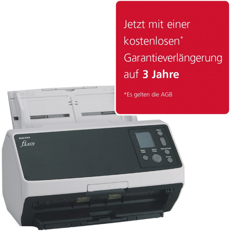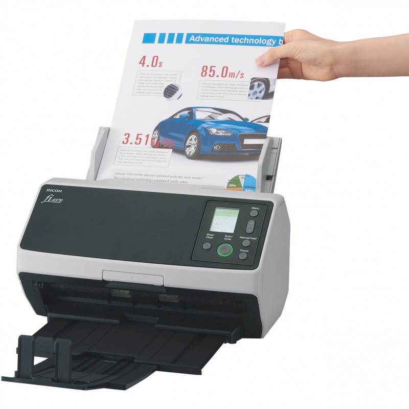 "Ricoh fi-8170. Maximum scan size: 216 x 355.6 mm, Optical scanning resolution: 600 x 600 DPI, ADF scan speed (b/w, A4): 70 ppm. Scanner type: ADF + Manual feed scanner, Product colour: Black, Grey, Control type: Buttons. Sensor type: Dual CIS, Light source: LED, Scan file formats: JPEG, PDF, PNG, TIFF. Auto document feeder (ADF) input capacity: 100 sheets. Maximum ISO A-series paper size: A4, Scanning media types supported: Business Card, Post Card(JPN), ISO A-series sizes (A0...A9): A4, A5, A6"\n"As the evolution of the market’s leading image scanners, the Ricoh fi-8000 series redefines the standard for business scanning by solving today’s challenges and providing a long-term strategic advantage for organisations adapting to the future of work. Boasting breakthrough optical technology and a wide range of innovative new patents, the Ricoh fi-8000 series supports digital transformation with industry-leading accuracy and user experience, built on technology you can trust.