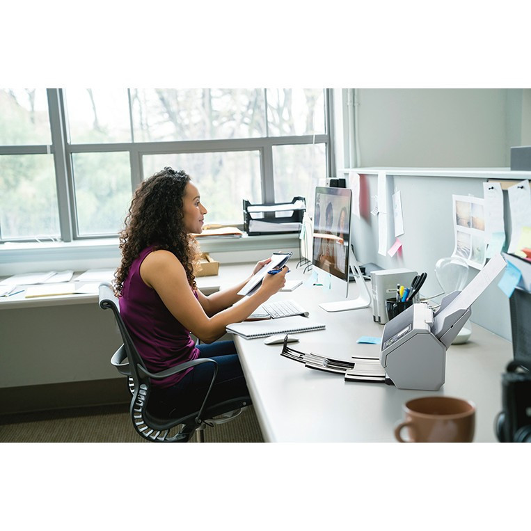Ergonomically designed stacker support neatly stacks scanned documents for faster, easier post-scan filing.