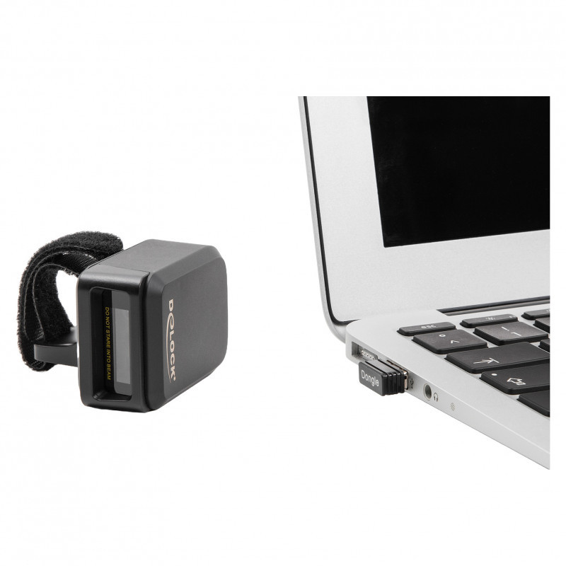 "DeLOCK Ring Barcode Scanner 1D and 2D with 2.4 GHz or Bluetooth. Type: Wearable bar code reader, Scanner type: 1D/2D, Sensor type: CMOS. Connectivity technology: Wireless, Standard interfaces: Bluetooth, Operating frequency: 2402 - 2480 MHz. Product colour: Black, LED indicators: Bluetooth, Charging, Power, Internal memory: 16 MB. Power source type: Battery, Battery technology: Lithium Polymer (LiPo), Battery type: Built-in battery. Weight: 40 g, Width: 37 mm, Depth: 53 mm"\n"This set by Delock consisting of two ring barcode scanners and a charging station, can be connected wirelessly to a PC, laptop or directly to a mobile phone or tablet. All common 1D and 2D barcode types can be precisely captured even at long distances. Additionally, the scanner recognizes barcodes displayed on displays and monitors.
