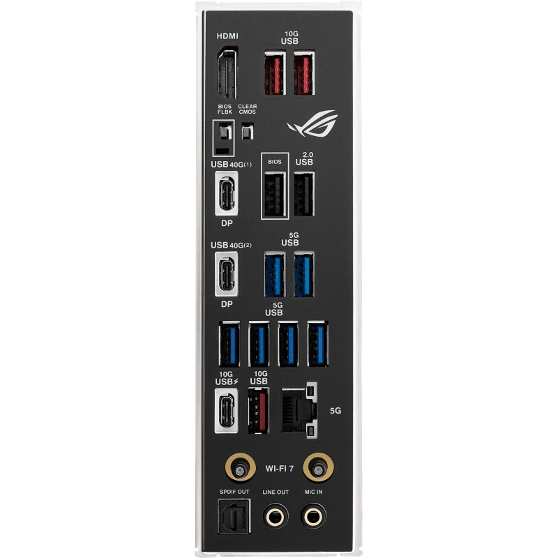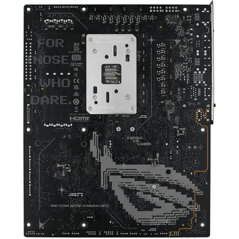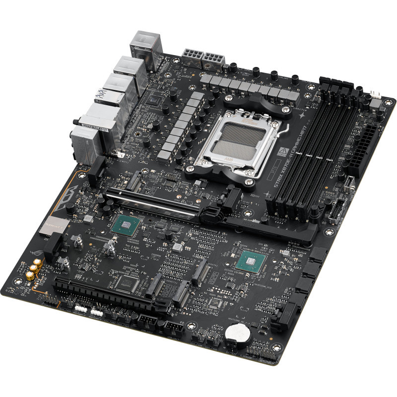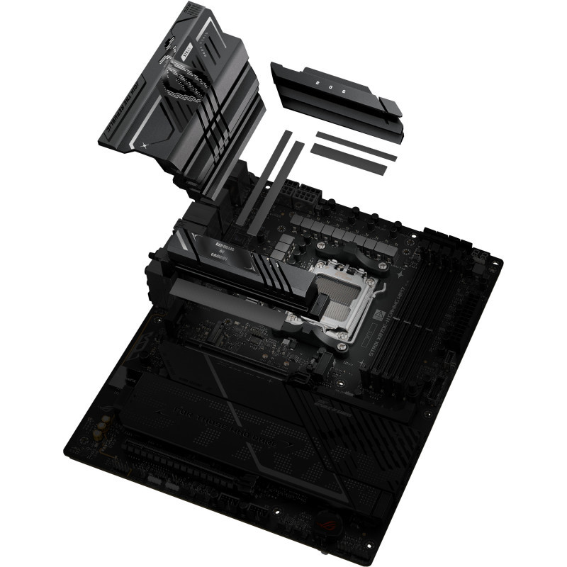 "ASUS ROG STRIX X870E-H GAMING WIFI7. Processor manufacturer: AMD, Processor socket: Socket AM5, Compatible processor series: AMD Ryzen 7000 Series, AMD Ryzen 8000 Series, AMD Ryzen 9000 Series. Supported memory types: DDR5-SDRAM, Maximum internal memory: 256 GB, Memory slots type: DIMM. Supported storage drive interfaces: M.2, SATA III, Supported storage drive types: HDD & SSD, RAID levels: 0, 1, 10, 5. Ethernet interface type: 5 Gigabit Ethernet, Top Wi-Fi standard: Wi-Fi 7 (802.11be), Wi-Fi standards: Wi-Fi 7 (802.11be). Component for: PC, Motherboard form factor: ATX, Motherboard chipset family: AMD"\n"ROG STRIX X870E-H GAMING WIFI7