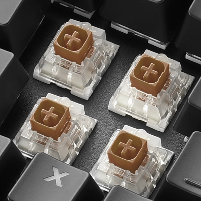 Tailored Switches and Keys. In addition to the 14 robust and abrasion-resistant PBT keycaps, the SGK60 offers a choice between three Kailh-BOX switches, allowing the gamer to freely personalize their own typing experience. The choice lies between the feedbackless red switches, the brown switches with a tactile feedback, and the white switches which give both a tactile and an acoustic feedback. While the typing sensation can be thus personalized as desired, the switches also impress with a life cycle of at least 80 million clicks. All of this is complemented with a sturdy, diamond-cut aluminum surface.
