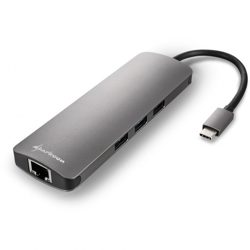 "Sharkoon USB 3.0 Type C Combo Adapter. Host interface: USB Type-C, Output interface: HDMI, RJ-45, USB 3.2 Gen 1 (3.1 Gen 1). Product colour: Grey, Maximum cable length: 132 m. Data transfer rate (max): 5 Gbit/s. Width: 130 mm, Depth: 44 mm, Height: 15 mm"\n"The USB 3.0 Type C Combo Adapter extends devices with USB Type C ports with a whole variety of new connection options. These include USB ports, a card reader, an HDMI port, a TRRS port and an RJ45 connector. When connected to the USB ports, devices can be fully used with the host device without additional effort.
