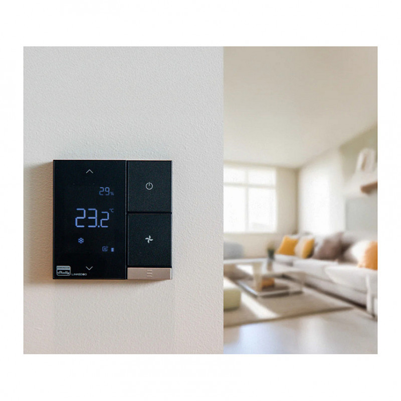 "Shelly LinkedGo smartes HVAC-Thermostat. Type: Digital thermostat, Wi-Fi standards: 802.11b, 802.11g, Wi-Fi 4 (802.11n), Product colour: Black. Width: 87 mm, Depth: 35 mm, Height: 87 mm"\n
