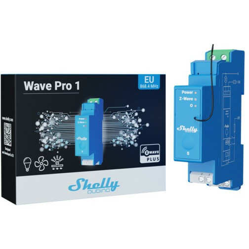 "Shelly Qubino Wave Pro 1. Product type: Solid-state relay, Product colour: Blue, Transmit power: 25 mW. Power consumption (typical): 0.3 W, Maximum current: 16 A, AC input voltage: 110 - 240 V. Dimensions (WxDxH): 94 x 19 x 69 mm, Weight: 60 g"\n"Professional 1-channel DIN rail Z-Wave® smart switch with dry contacts