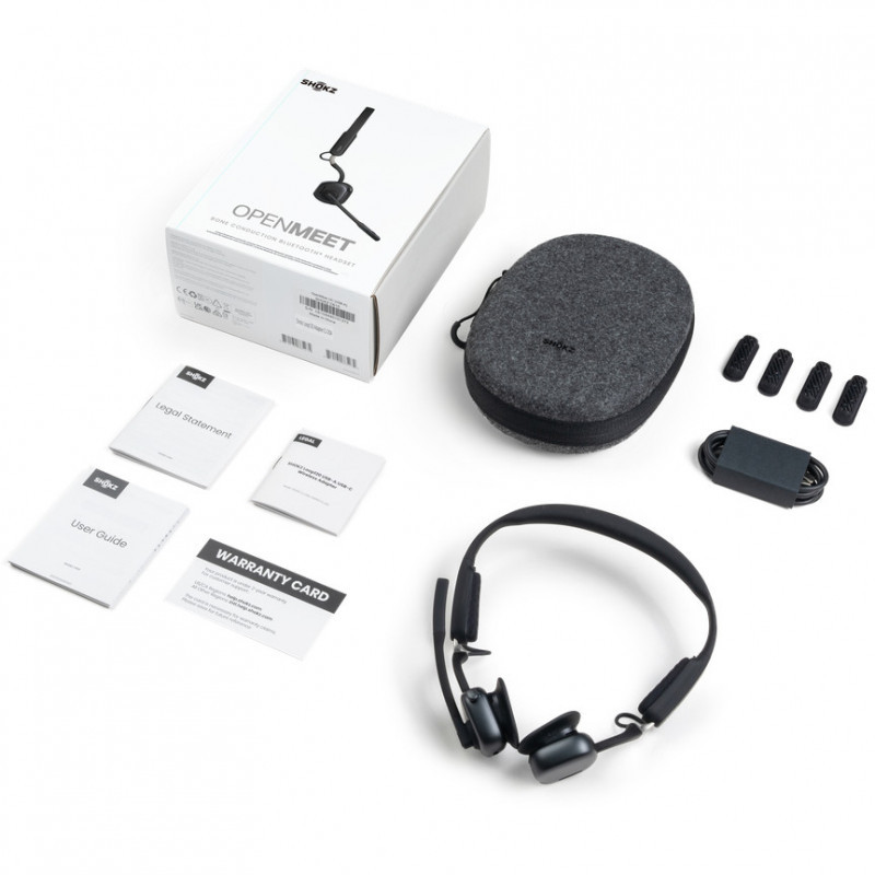"SHOKZ OpenMeet Wireless Bluetooth Bone Conduction Videoconferencing Headset. Product type: Headset. Connectivity technology: Wireless, Bluetooth. Recommended usage: Office/Call center, Cable length: 1 m. Weight: 78 g. Product colour: Black"\n"OpenMeet’s revolutionary open-ear design, offering pressure-free, all-day comfort with TitaniumFlex technology and customizable pressure relief cushions. Enjoy crystal-clear audio with advanced DualPitch™ technology and a dual-microphone system. With up to 15 hours of battery life, OpenMeet delivers reliable performance for professionals."