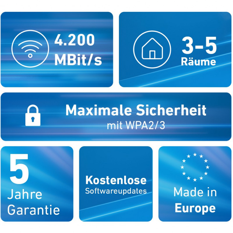 "Mesh Set 4200. Product colour: Red, White, Antenna type: 2x2/4x4, Product type: Network repeater. Wi-Fi band: Dual-band (2.4 GHz / 5 GHz), Top Wi-Fi standard: Wi-Fi 6E (802.11ax), WLAN data transfer rate (max): 4200 Mbit/s. Power consumption (typical): 9 W, AC input voltage: 230 V, AC input frequency: 50 Hz. Width: 90 mm, Depth: 145 mm, Height: 190 mm"\n