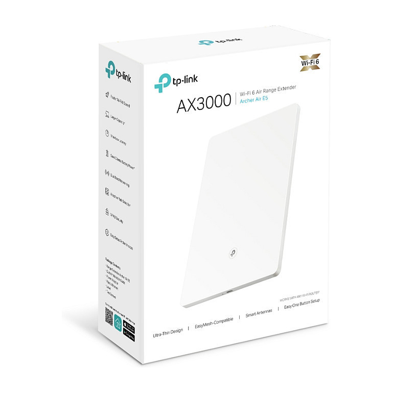 "TP-Link Archer AX3000 Dual-Band Wi-Fi 6 Air Range Extender. Type: Network repeater, Data transfer rate: 2976 Mbit/s. Product colour: White, Mounting type: Wall, Certification: FCC, RoHS. Output voltage: 12 V, Output current: 2 A. Width: 148 mm, Depth: 8 mm, Height: 210 mm"\n"Ultra-Thin Design,