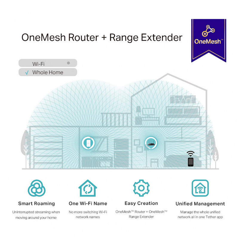 OneMesh™ is a simple way to form a Mesh network with a single Wi-Fi name for seamless whole-home coverage. Just connect a OneMesh™ range extender to a OneMesh™ router. No more searching around for a stable connection.