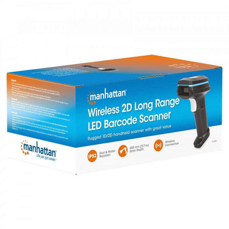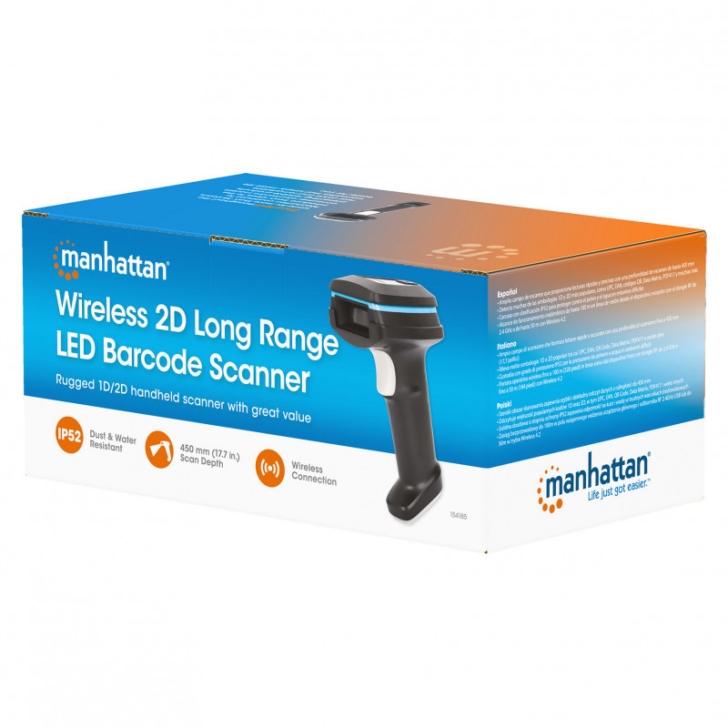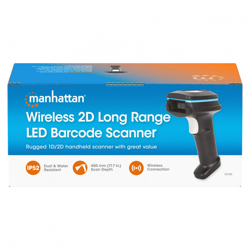 The Manhattan Wireless 2D Long Range LED Barcode Scanner is your durable solution for streamlined data entry and enhanced efficiency to help improve routine transactions and automate paper-based processes. Capture barcodes from mobile devices, 1D and 2D Paper barcodes on items for sale, coupons, loyalty cards and more. This scanner is built for such different industries as retail/point-of-sale, healthcare, hospitality, warehousing or logistics.