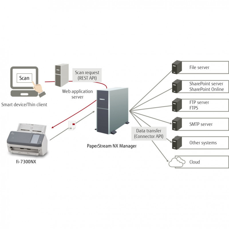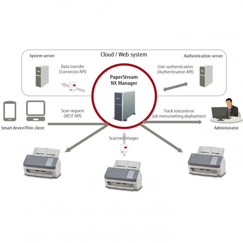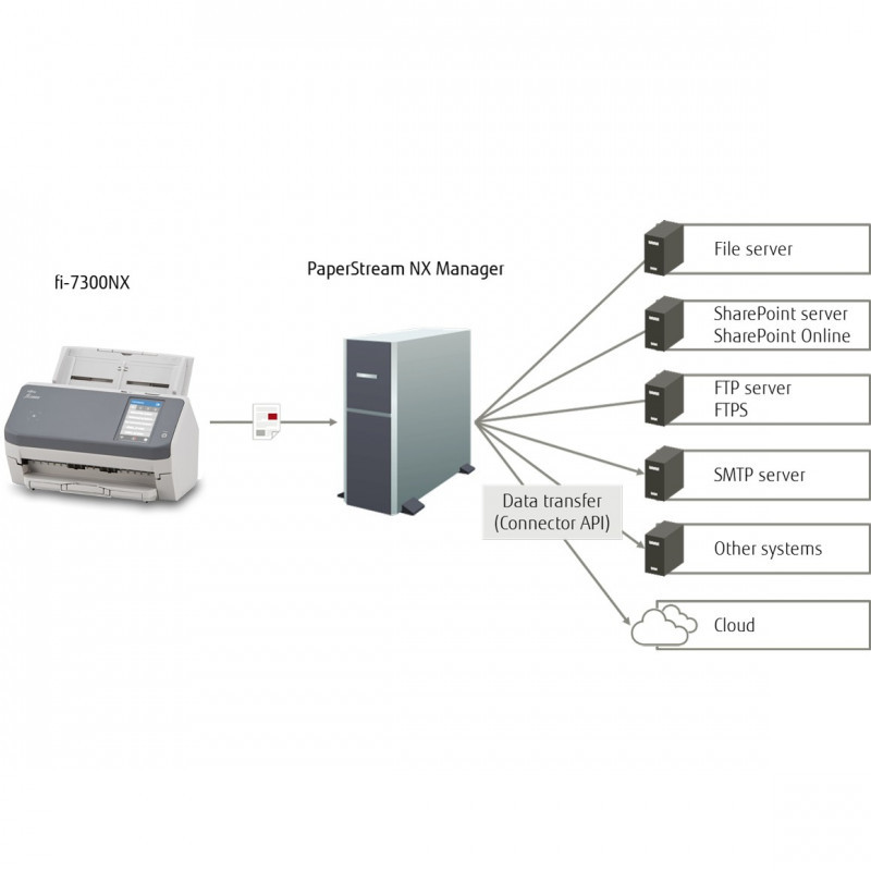 The fi-7300NX supports NFC (Type-A and Type-B) authentication and user authentication with username and password input on the touch screen. It is also possible for different job menus to be assigned to each scanner, and avoid any authentication processes. With PaperStream NX Manager, users can scan from mobile or web applications opened up on smart devices or thin client terminals. Seamless integration into company systems enables use of a variety of devices for scanning operations. The user authentication function, job menu, and other scan settings are all centrally managed with PaperStream NX Manager and Scanner Central Admin. With the fi-7300NX’s server software, there is no need for the conventional single client computer to scanner environment and the system administrator to stand by the scanner. This reduces the total burden of installation, expansion, operation, and management. Manage jobs and process images with PaperStream NX Manager. Monitor scanner operation with Scanner Central Admin.