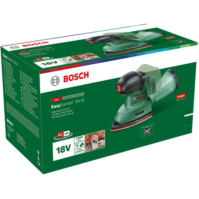 The powerful, cordless EasySander 18V-8 is perfect for a range of projects. Multifunctional, it is designed to work smoothly in corners, on edges, and on medium-sized, flat surfaces. Sanding paper changes are quick and easy due to the hook-and-loop fastening system. This tool is perfect for hardwood, softwood, and varnished and painted surfaces, as well as for completing furniture, doors, frames, etc. The easily removable Microfilter dust box reduces dust to keep the working area cleaner. The built-in Bosch Syneon Technology provides optimum power and maximum runtime. The tool belongs to the 18V POWER FOR ALL system. One battery can be used in all 18V POWER FOR ALL tools."