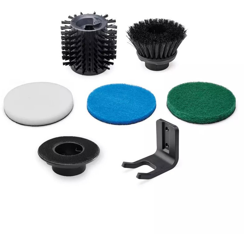 "Einhell PICOBELLA 18/90. Product colour: Black, Red, International Protection (IP) code: IPX4. Power source type: Battery. Quantity per pack: 1 pc(s). Weight: 1.5 kg"\n"The Einhell cordless surface brush PICOBELLA 18/90 is a versatile helper for cleaning indoors and outdoors, such as in the garden, garage or in the home. As a member of the limitlessly combinable Power X-Change battery system, each battery in the system can be combined with the cordless cleaning brush. It is equipped with a 2-stage speed setting in order to be able to work according to the material and application. To make wet cleaning possible, the device is equipped with a battery cover and sealing ring according to water protection class IPX4. As a result, the Power X-Change battery is optimally protected against splash water. The inserted brush can also be provided with a removable splash guard cover with rubber lip. This protects you from splashing water and dirt during cleaning with the rotating brush. Softgrip surfaces ensure non-slip and comfortable work. Two brush heads are included in delivery: 1x brush MEDIUM 90/20 for cleaning robust surfaces such as tiles, stone or concrete and 1x brush SOFT 120/50 for gentle but effective cleaning of different surfaces such as window sills, garden furniture or car rims. In addition, three different cleaning pads are included, such as 1x white melamine foam pad as a dirt eraser without additional cleaning agent for smooth surfaces such as glass, doors/walls and leather, 1x blue microfibre pad for sensitive surfaces such as plastic, glass or metal and 1x green kitchen fibre pad for removing coarse dirt, rust or lime on robust surfaces such as tempered glass and cast iron. The pads can be attached to the cleaning brush using the included pad holder. Brushes and pads can be changed without tools via a quick or hook-and-loop fastener. The supplied wall mount allows easy storage of the battery surface brush. Comes without battery or charger. These are available separately."
