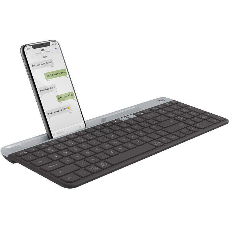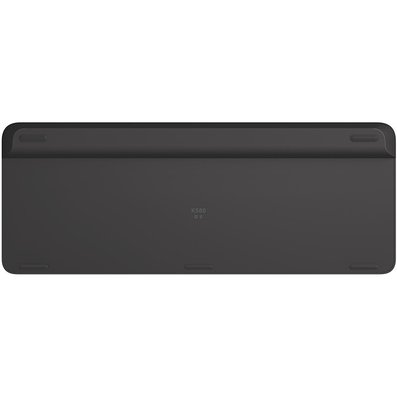 "Logitech Slim Multi-Device Wireless Keyboard K580. Keyboard form factor: Full-size (100%). Keyboard style: Straight. Connectivity technology: Wireless, Device interface: RF Wireless + Bluetooth, Keyboard layout: QWERTY, Recommended usage: Universal. Product colour: Graphite"\n