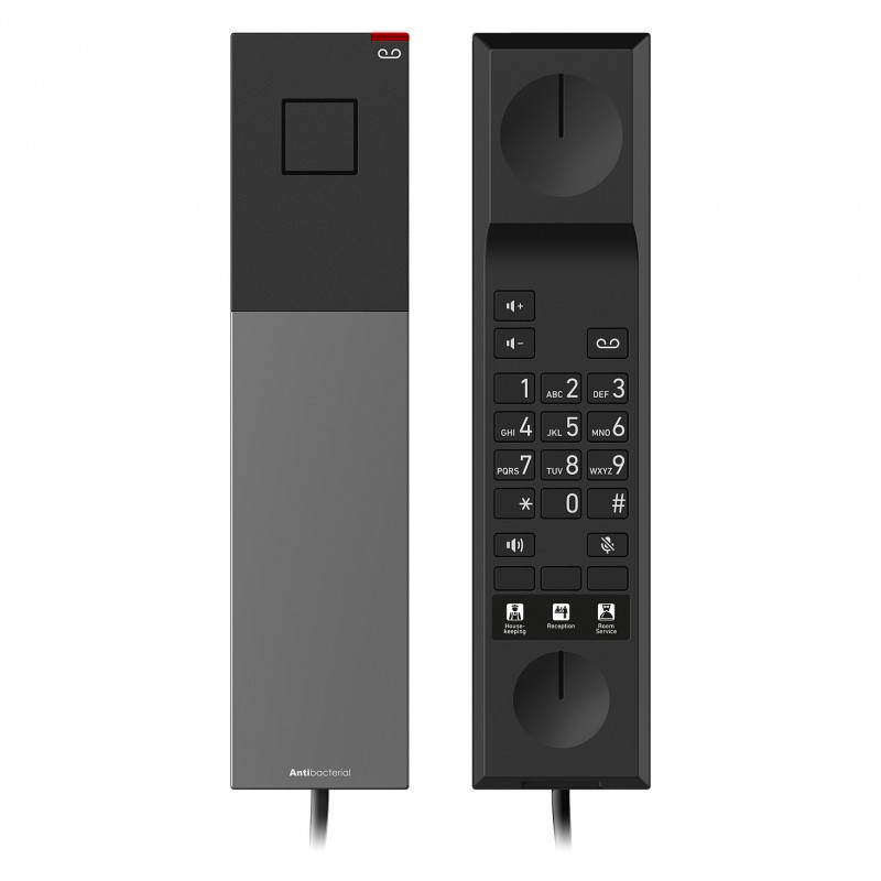 The Snom HD300A is a cleverly designed, corded analogue telephone that has been specially developed for the requirements of the hotel and accommodation sector. It not only impresses with its elegant design, but also with its high level of functionality and user-friendliness. A particular highlight is the antibacterial housing, which offers effective protection against germs and therefore fulfils the high hygiene requirements of everyday hotel life. The phone's highly visible LED ensures that guests are easily alerted to incoming calls or waiting messages, which significantly increases the comfort and satisfaction of your guests.