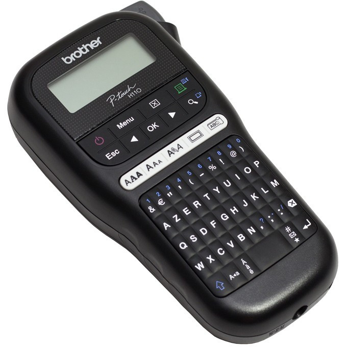 "Brother PT-H110. Print technology: Thermal transfer, Maximum resolution: 180 x 180 DPI, Print speed: 20 mm/sec. Keyboard layout: QWERTY. Tape type: TZe. Supported paper width: 3.5, 6, 9, 12 mm. Product colour: Black"\n"Portable P-touch label maker great for home, home office and on-the-go use. Features a QWERTY keyboard, convenient one-touch keys and an easy-view display to preview your labels before printing. Easily personalize your labels with 3 fonts, 14 frames, and over 250 symbols. Also organize your wires and cables with the useful cable labeling feature. Creates labels with 1 or 2 lines of text. Built-in memory stores up to 15 labels for fast reprinting. Uses durable, laminated easy-peel ""TZe"" tape up to 12mm (~1/2"") wide. Powered by 6 AAA batteries or optional AC adapter (each sold separately). Includes 12mm starter tape.