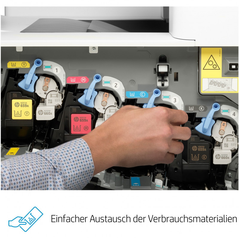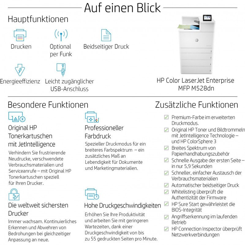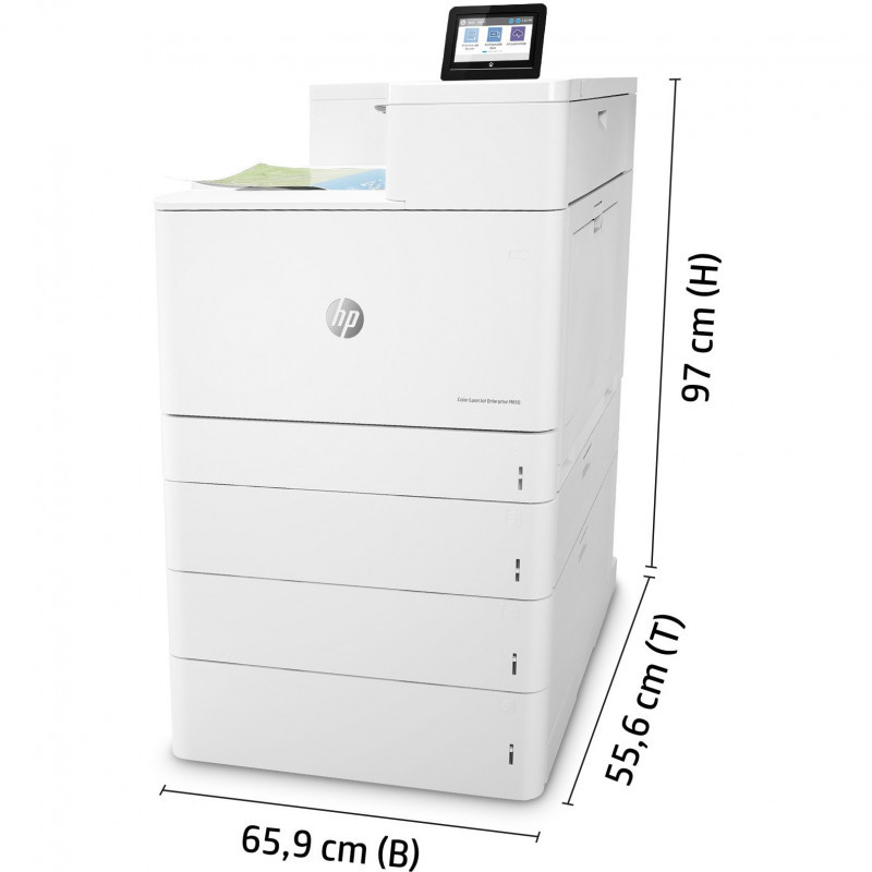 "HP Color LaserJet Enterprise M856dn. Print technology: Laser, Colour. Number of print cartridges: 4, Maximum duty cycle: 250000 pages per month. Maximum resolution: 1200 x 1200 DPI. Maximum ISO A-series paper size: A3. Print speed (black, normal quality, A4/US Letter): 56 ppm, Duplex printing. Display: CGD. Network ready. Product colour: White"\n" Print phenomenal colour while maximising uptime – now with original HP JetIntelligence toner technology. Expect consistently fast output, brilliant prints, and the world’s strongest security.[1]