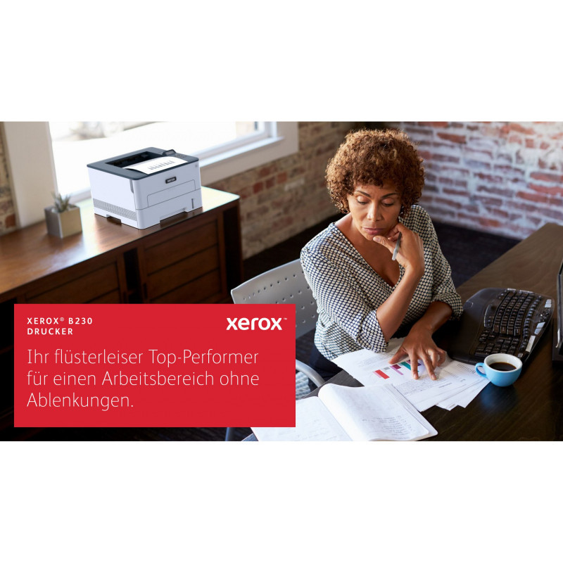 "Xerox B230 A4 34ppm Wireless Duplex Printer PCL5e/6 2 Trays Total 251 Sheets. Print technology: Laser. Number of print cartridges: 1, Maximum duty cycle: 30000 pages per month. Maximum resolution: 2400 x 2400 DPI. Maximum ISO A-series paper size: A4. Print speed (black, normal quality, A4/US Letter): 34 ppm, Duplex printing. Wi-Fi. Product colour: Blue, White"\n"The Xerox B230 printer includes built-in Wifi with Wi-Fi Direct and is easy to set up with Xerox® Smart Start Software, so it is ready to work hard right out of the box. Print from your mobile devices with support for Apple AirPrint, Mopria Print Service and Chromebook printing. Designed for small businesses with features such as automatic 2-sided printing on letter and legal sized paper, standard paper capacity of 250 sheets, a 1 GHz dual core processor with 256 MB of memory, and monthly print volumes up to 2,500 pages, the B230 is a workhorse. And our Green World Alliance program offers hassle-free toner cartridge recycling."
