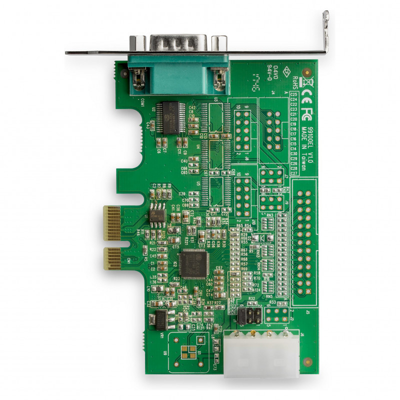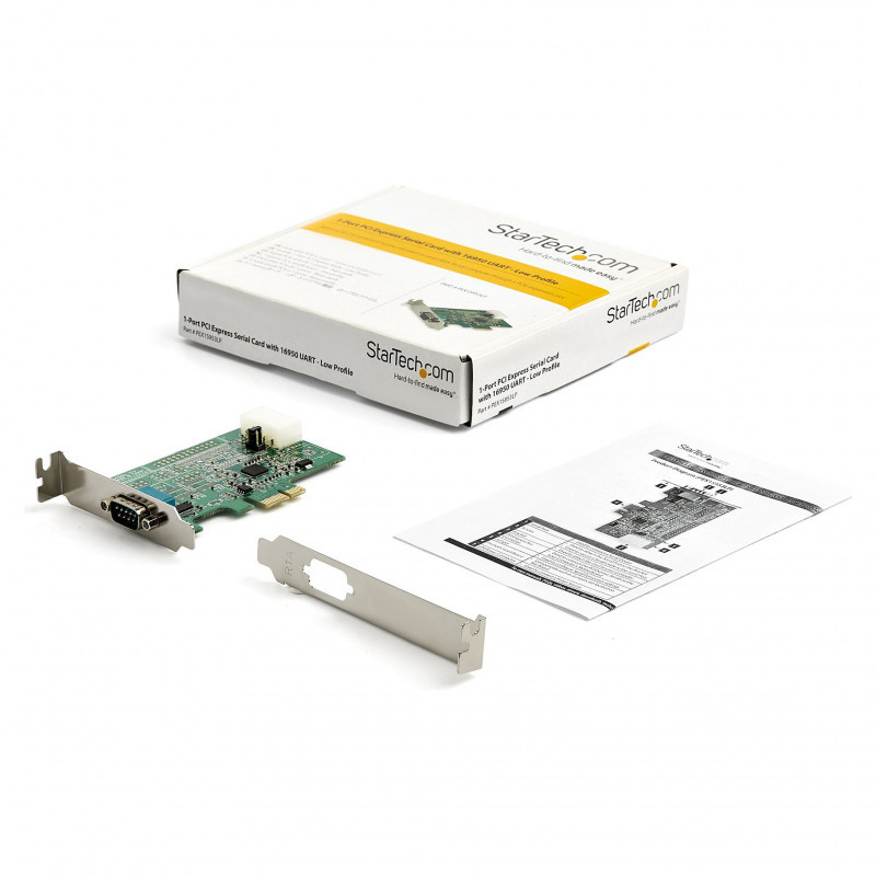 "StarTech.com 1-port PCI Express RS232 Serial Adapter Card - PCIe RS232 Serial Host Controller Card - PCIe to Serial DB9 - 16950 UART - Low Profile Expansion Card - Windows & Linux. Host interface: PCIe, Output interface: Serial, Expansion card standard: PCIe 1.1. Product colour: Green, Mean time between failures (MTBF): 277385 h. Chipset: Asix AX99100, Baud rate: 921.4 Kbit/s, FIFO (First In, First Out): 256 B. Windows operating systems supported: Windows 10, Windows 10 Education, Windows 10 Education x64, Windows 10 Enterprise, Windows 10..., Server operating systems supported: Windows Server 2003, Windows Server 2008 R2, Windows Server 2012, Windows Server 2012 R2, Windows.... Width: 67 mm, Depth: 98 mm, Height: 150 mm"\n"PCI Express to Serial Adapter | 921.4Kbps | Windows® and Linux® Compatible