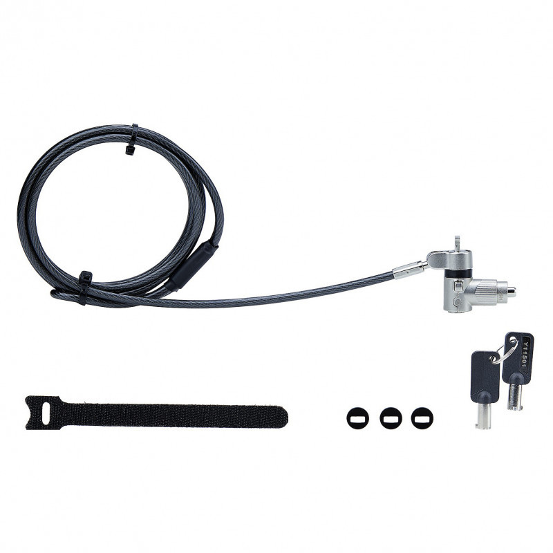 A unique on-the-fly lock tip mechanism enables quickly adapting the lock tip to fit different security slot types. Simply rotate the lock selection dial to change the shape of the lock tip to match the security slot, without requiring additional tools or carry separate lock tips. The cut-resistant steel security cable is 6.6ft (2m) long providing reach and durability.