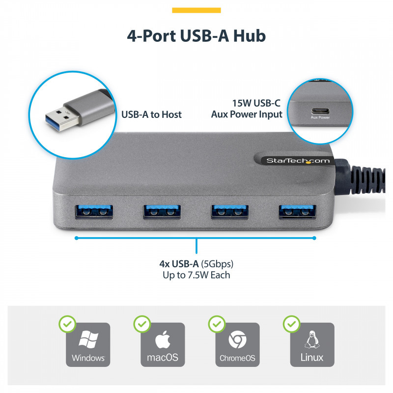 "StarTech.com 4-Port USB-A Hub, 5Gbps, Bus Powered, USB-A to 4x USB-A Hub with USB-C Auxiliary Power Input, 1ft/30cm Host Cable, Portable Desktop/Laptop USB Hub. Host interface: USB 3.2 Gen 1 (3.1 Gen 1) Type-A, Hub interfaces: USB 3.2 Gen 1 (3.1 Gen 1) Type-A, USB Type-C. Data transfer rate: 5000 Mbit/s, Product colour: Grey, Housing material: Plastic. Power supply type: USB. Other operating systems supported: ChromeOS. Width: 54 mm, Depth: 420 mm, Height: 16 mm"\n"Connect multiple 5Gbps USB-A peripherals that draw high power to your computer using a single USB-A port.