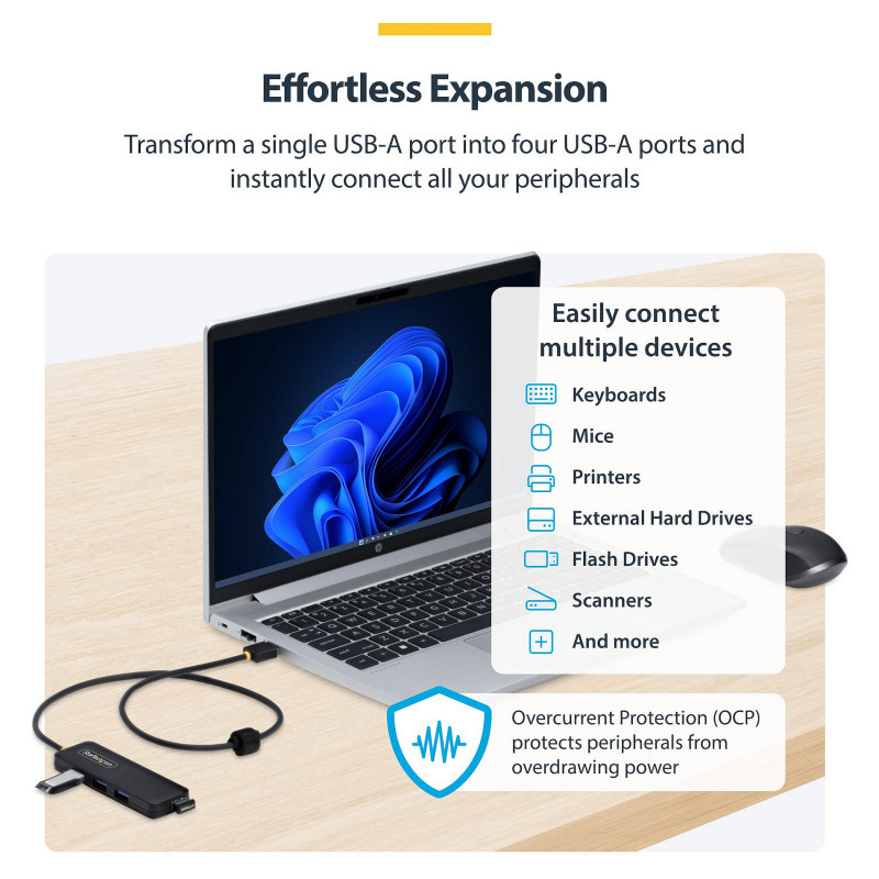 "StarTech.com 4-Port USB-A Hub, 5Gbps, Bus Powered, USB-A to 4x USB-A Mini Hub, Extra Long 2ft/61cm Host Cable, PCR Plastic, Portable Desktop / Laptop USB Hub. Host interface: USB 3.2 Gen 1 (3.1 Gen 1) Type-A, Hub interfaces: USB 3.2 Gen 1 (3.1 Gen 1) Type-A. Data transfer rate: 5000 Mbit/s, Product colour: Black, Housing material: Plastic. Power supply type: USB. Width: 31.8 mm, Depth: 95.5 mm, Height: 11.5 mm. Quantity per pack: 1 pc(s), Package width: 170 mm, Package depth: 100 mm"\n"Add four external USB 3.0 ports to your PC or laptop with a portable, PCR plastic hub