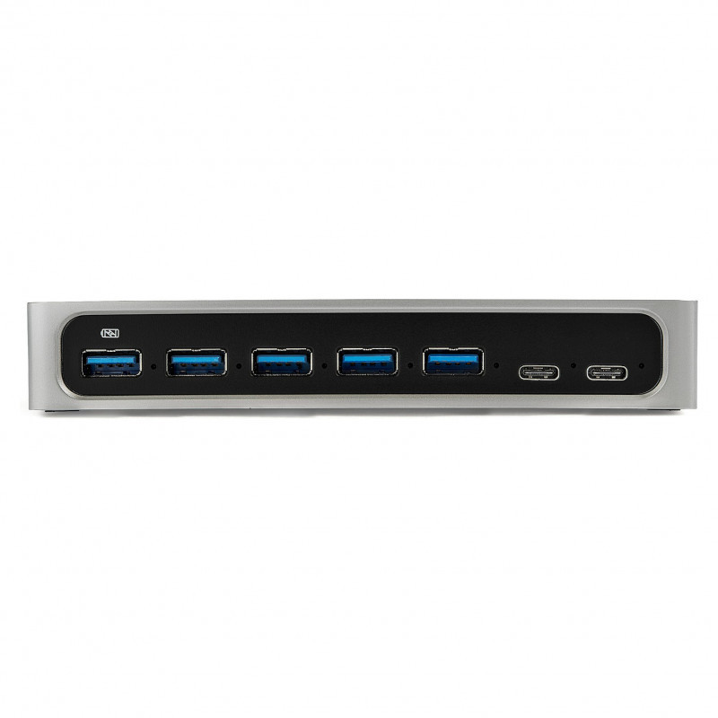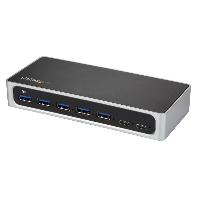 "StarTech.com 7 Port USB C Hub with Fast Charge Port - USB-C to 5x USB-A 2x USB-C (USB 3.0 SuperSpeed 5Gbps) - Self Powered USB 3.2 Gen 1 Type-C Hub w/ Power Adapter - Desktop/Laptop Hub. Host interface: USB 3.2 Gen 1 (3.1 Gen 1) Type-B, Hub interfaces: USB 3.2 Gen 1 (3.1 Gen 1) Type-A, USB 3.2 Gen 1 (3.1 Gen 1) Type-C. Data transfer rate: 5000 Mbit/s, Product colour: Black, Silver, Housing material: Plastic. Power consumption (typical): 48 W, Input voltage: 100 - 240 V, Input current: 1 A. Width: 65 mm, Depth: 149 mm, Height: 24 mm. Package width: 149 mm, Package depth: 213 mm, Package height: 51 mm"\n"Turn a USB Type-C port on your laptop into five USB Type-A ports (5Gbps) and two USB Type-C ports