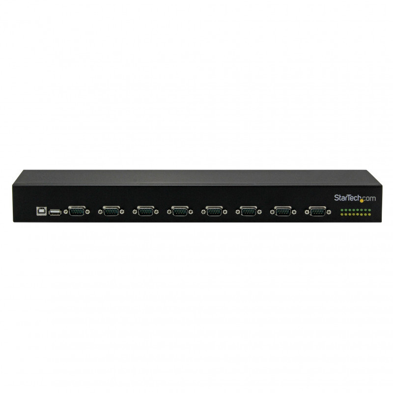 "StarTech.com 8-Port USB-to-Serial Adapter Hub. Host interface: USB 2.0, Hub interfaces: Serial. Product colour: Black, Housing material: Aluminium. Power consumption (max): 36 W, Input voltage: 100 - 240 V, Input current: 1.5 A. Windows operating systems supported: Windows 10, Windows 10 Education, Windows 10 Education x64, Windows 10 Enterprise, Windows 10..., Mac operating systems supported: Mac OS X 10.10 Yosemite, Mac OS X 10.11 El Capitan, Mac OS X 10.12 Sierra, Mac OS X 10.13 High..., Server operating systems supported: Windows Server 2003, Windows Server 2008 R2, Windows Server 2012, Windows Server 2012 R2. Width: 120 mm, Depth: 430 mm, Height: 45 mm"\n"Convert a single USB port into eight serial ports, and connect multiple hubs together for a scalable solution