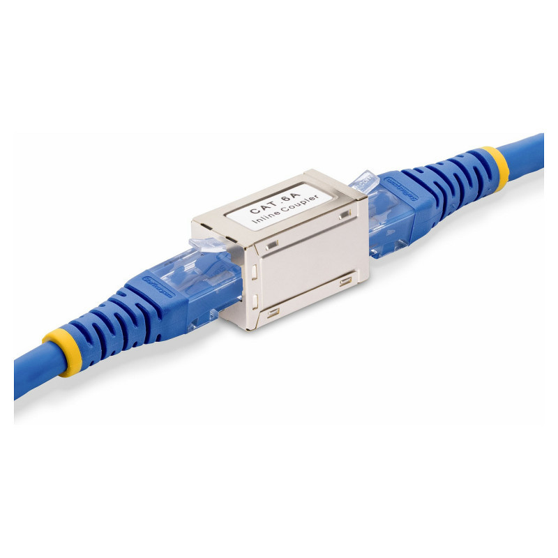 "StarTech.com Shielded RJ45 Coupler, Inline Cat6a Coupler, Female to Female (F/F) T568B Pinout, Shielded Ethernet Cable Extension. Connector 1: RJ-45, Connector 2: RJ-45, Connector contacts plating: Gold. Product colour: Silver"\n"Join two shielded RJ45 Cat6a cables using this Inline Coupler