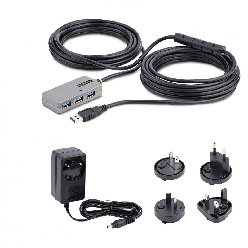 "StarTech.com USB Extender Hub, 10m USB 3.0 Extension Cable with 4-Port USB-A Hub, Active/Bus Powered USB Repeater Cable, Optional 20W Power Supply Included, ESD Protection. Host interface: USB 3.2 Gen 1 (3.1 Gen 1) Type-A, Hub interfaces: USB 3.2 Gen 1 (3.1 Gen 1) Type-A. Data transfer rate: 5000 Mbit/s, Product colour: Black, Silver, Housing material: Plastic. Power supply type: DC, Power consumption (typical): 20 W, Input voltage: 100 - 240 V. Width: 40 mm, Height: 18 mm, Weight: 100 g. Package width: 190 mm, Package depth: 225 mm, Package height: 55 mm"\n"USB Extender Hub | USB 3.0 Extension Cable with 4-Port USB Hub | Bus Powered | 32.8ft Long Cable