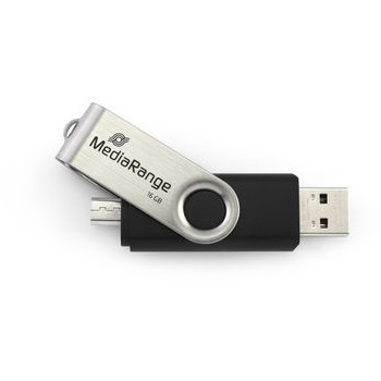"MediaRange MR931-2. Capacity: 16 GB, Device interface: USB Type-A / Micro-USB, USB version: 2.0, Read speed: 15 MB/s, Write speed: 5 MB/s. Form factor: Swivel. Weight: 15 g. Product colour: Silver, Black"\n"MediaRange USB combo flash drive with micro USB (OTG) plug, 16GB