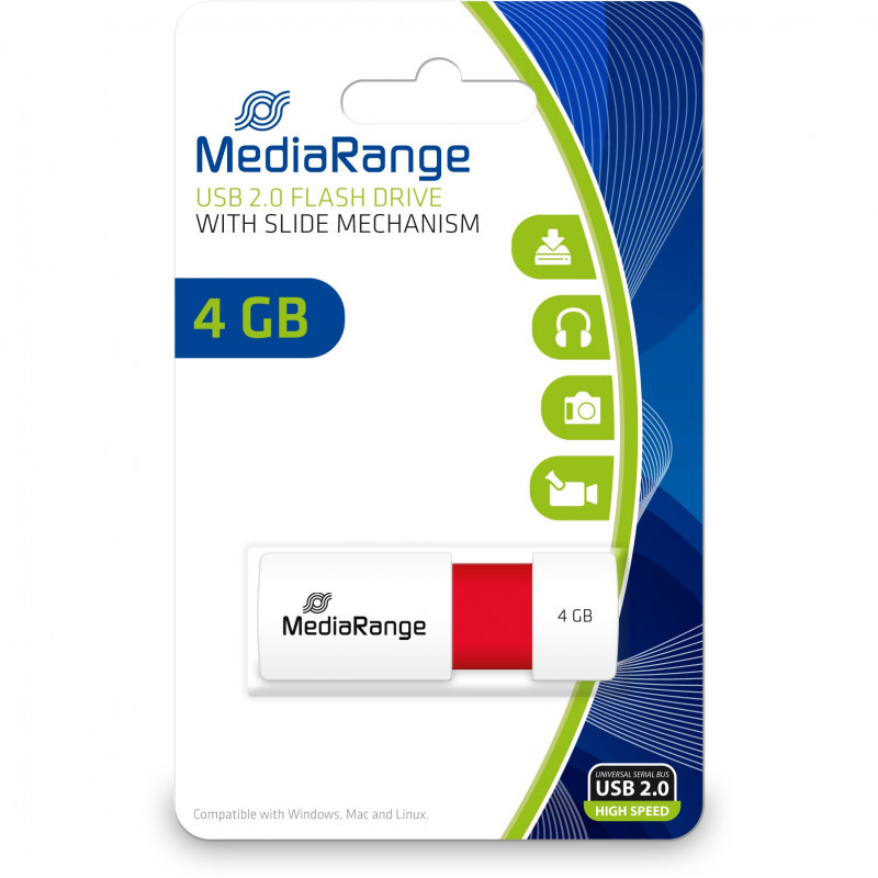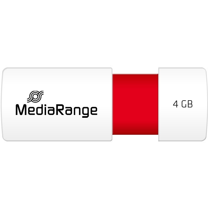 "MediaRange MR970. Capacity: 4 GB, Device interface: USB Type-A, USB version: 2.0, Read speed: 10 MB/s, Write speed: 3 MB/s. Form factor: Slide. Weight: 8 g. Product colour: Red, White"\n"MediaRange flash drives provide quality and reliability. Our USB sticks are perfect for archiving and exchanging data. The USB connection allows you to access your data safely and conveniently - anytime, anywhere. Our compact USB sticks are easy to carry ensuring your data is always readily available."