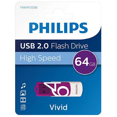 "Philips FM64FD05B. Capacity: 64 GB, Device interface: USB Type-A, USB version: 2.0. Form factor: Swivel. Weight: 8 g. Product colour: Purple, White"\n"Data transfer with high speed USB 2.0