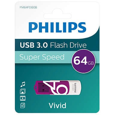 "Philips FM64FD00B. Capacity: 64 GB, Device interface: USB Type-A, USB version: 3.2 Gen 1 (3.1 Gen 1). Form factor: Swivel. Weight: 8 g. Product colour: Purple, White"\n"Fast data transfer with super speed USB 3.0