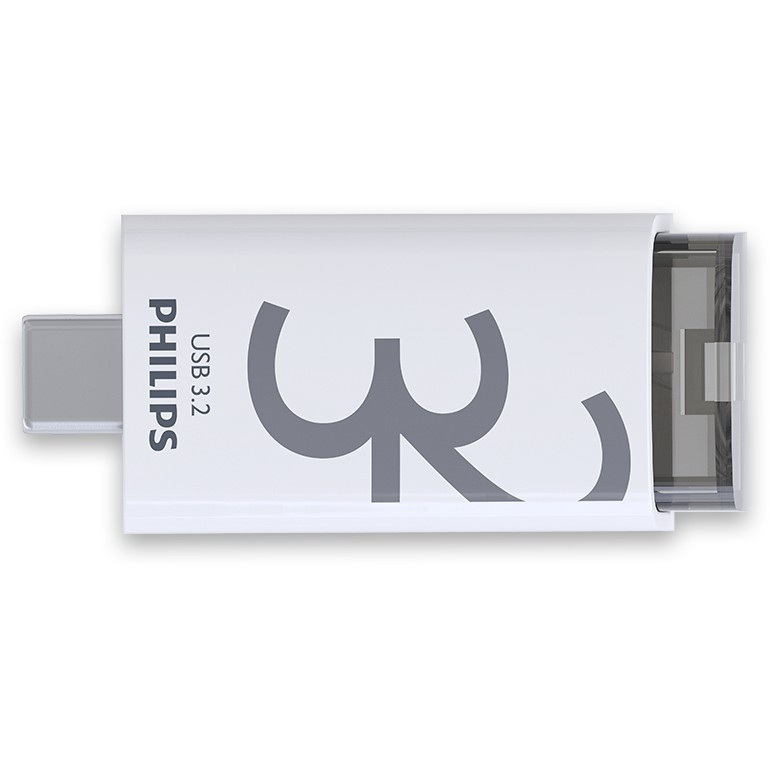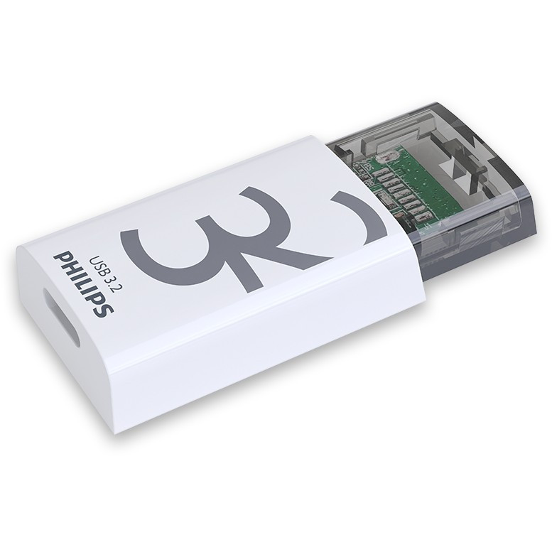 "Philips Click. Capacity: 32 GB, Device interface: USB Type-C, USB version: 3.2 Gen 1 (3.1 Gen 1), Read speed: 120 MB/s, Write speed: 50 MB/s. Form factor: Cap, Product colour: Transparent, White"\n"Philips USB 3.2 Click