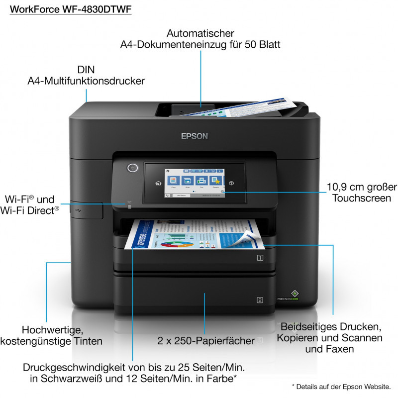 "Epson WorkForce Pro WF-4830DTWF. Print technology: Inkjet, Printing: Colour printing, Maximum resolution: 4800 x 2400 DPI, Print speed (colour, normal quality, A4/US Letter): 22 ppm. Copying: Colour copying. Scanning: Colour scanning, Optical scanning resolution: 1200 x 1200 DPI. Maximum ISO A-series paper size: A4. Wi-Fi. Product colour: Black"\n"Expand your potential with this A4 multifunction inkjet. It offers high-quality, low-cost-printing and flexible wireless solutions.