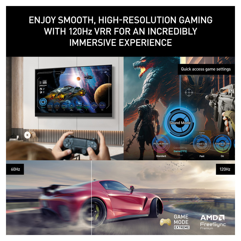 Quantum Dot technology delivers a wider colour palette with vivid, lifelike tones, while Dolby Atmos and Surround Sound Pro create immersive audio. The HCX Processor ensures sharp contrast and natural colour, tuned for true-to-life viewing."