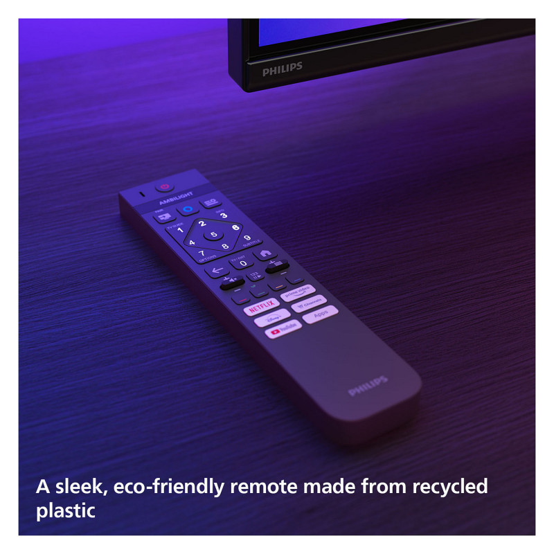 The sleek, almost bezel-free screen looks great in any room — and Ambilight can create mesmerising mood lighting when the screen's off. The TV remote is made from recycled plastic and our packaging uses FSC-certified recycled cardboard with inserts printed on recycled paper.