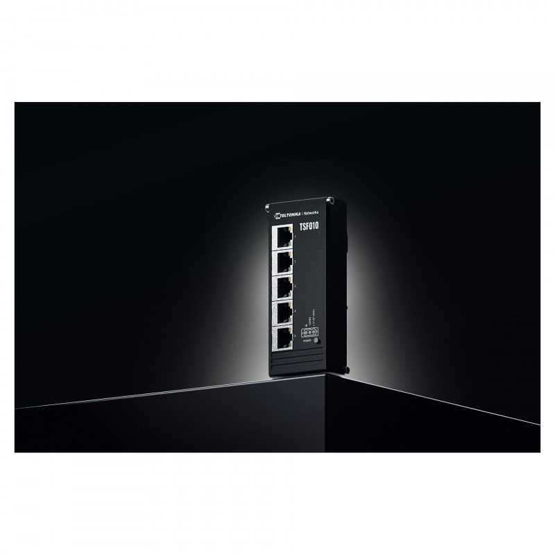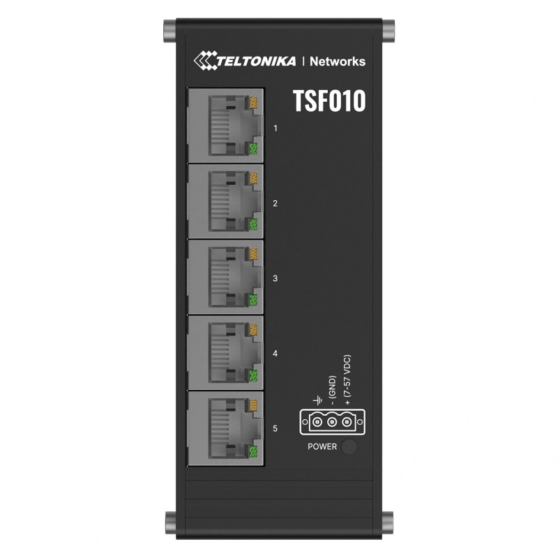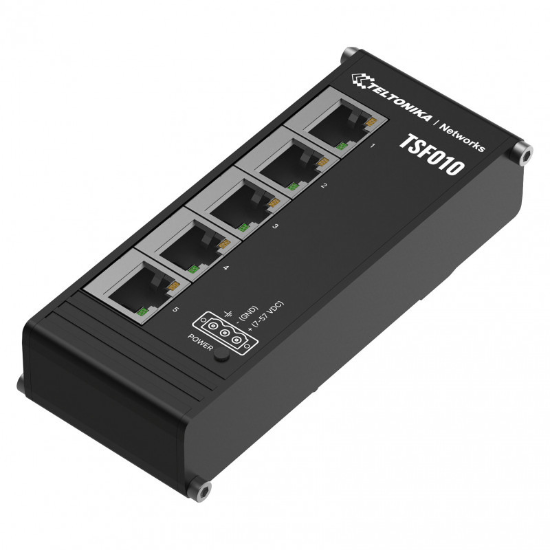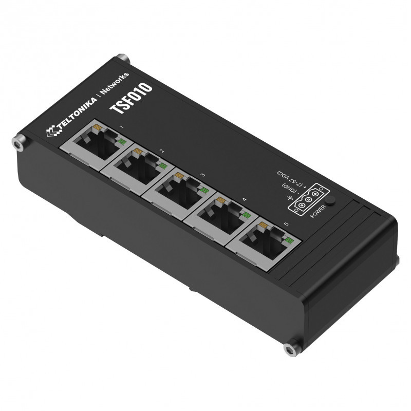 "Teltonika NETWORKS TSF010 Flat Ethernet Switch. Switch type: Unmanaged. Basic switching RJ-45 Ethernet ports type: Fast Ethernet (10/100), Basic switching RJ-45 Ethernet ports quantity: 5. Full duplex. MAC address table: 2048 entries, Switching capacity: 10 Gbit/s. Networking standards: IEEE 802.3, IEEE 802.3ab, IEEE 802.3u, IEEE 802.3x. Form factor: DIN rail"\n"The TSF010 is an unmanaged Ethernet switch featuring a flat design and integrated DIN rail mounting for plug-and-play deployment in industrial cabinet applications. This Ethernet switch is compact and lightweight, measuring 113 x 28 x 50 mm and weighing only 142 g. Its 3-pin power input and 7-57 VDC voltage range make it a flexible unmanaged switch tailor-made for industrial use. The TSF010 is equipped with five 10/100 Mbps RJ45 ports for reliable connectivity."