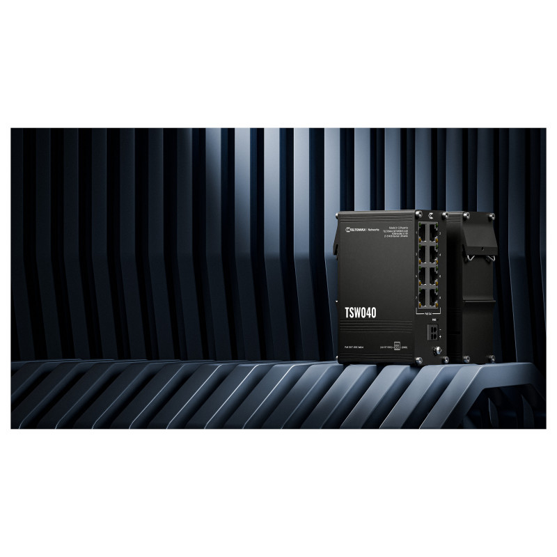 "Teltonika NETWORKS TSW040 8-Port PoE+ Switch. Switch type: Unmanaged. Basic switching RJ-45 Ethernet ports type: Fast Ethernet (10/100), Basic switching RJ-45 Ethernet ports quantity: 8. MAC address table: 2048 entries, Switching capacity: 20 Gbit/s. Networking standards: IEEE 802.3ab, IEEE 802.3af, IEEE 802.3at, IEEE 802.3az, IEEE 802.3i, IEEE 802.3u, IEEE 802.3x. DC input voltage: 7 - 57 V. Power over Ethernet (PoE)"\n"The TSW040 is an unmanaged 8-port PoE+ switch by Teltonika, featuring eight RJ45 ports with a total power budget of 240 W, or up to 30 W per port. This compact and rugged 8-port switch also features a 2-pin power input and an integrated DIN rail for easy mounting, making it ideal for industrial applications. The TSW040 has a wide voltage range of 7-57 VDC and a PoE-out voltage range of 44-57 VDC. "